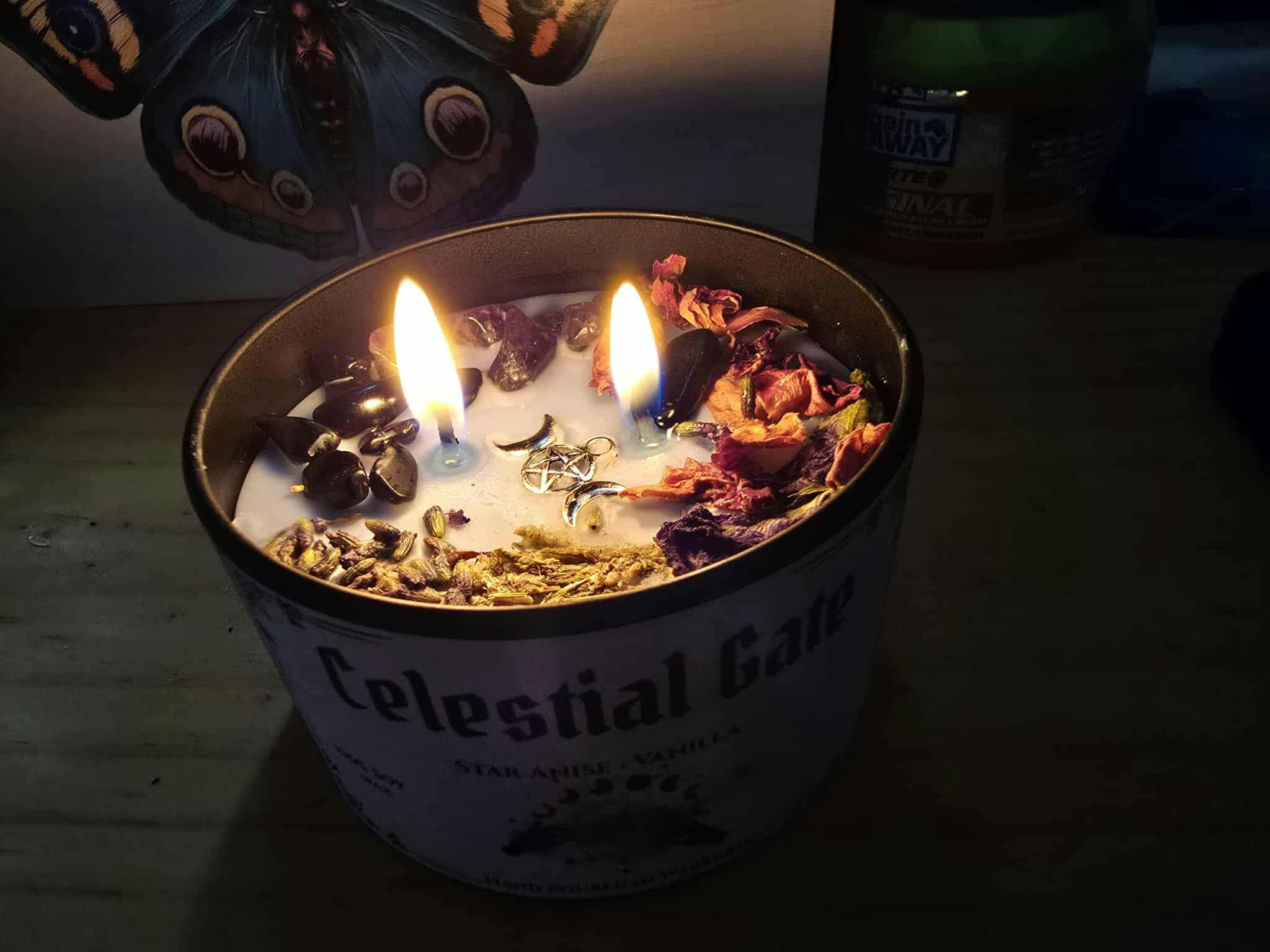 Each burn releases an enchanting blend of star anise and vanilla, evoking the feeling of stepping beyond the veil into sacred sleep. Topped with moonstone, blue pea flower, and herbs known for third-eye activation, Celestial Gate supports dreamwork, spiritual rest, and connection to higher realms.